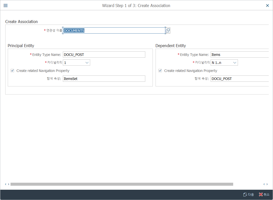연관성 이름은 알아서 지어주고, 왼쪽에 Header타입 가져올 때 사용한 이름을, 오른쪽은 아이템 라인을 지정해준다. (F4누르면 있음) 헤더 1 : 라인 n이기 때문에 카디널리티는 위 화면처럼 주었음.