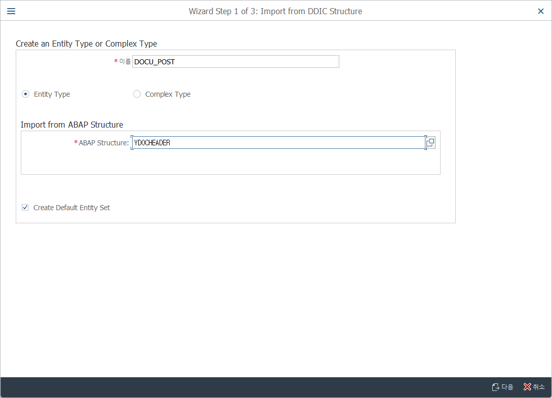 사용할 이름을 정해주고, 아까 만든 HEADER를 ABAP Structure에 넣어주고 다음.
