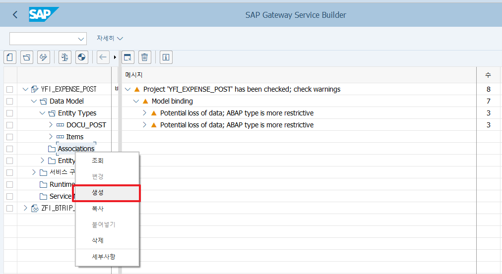이제 헤더와 아이템을 연결해주기 위해 Associations 폴더 우클릭 후 생성