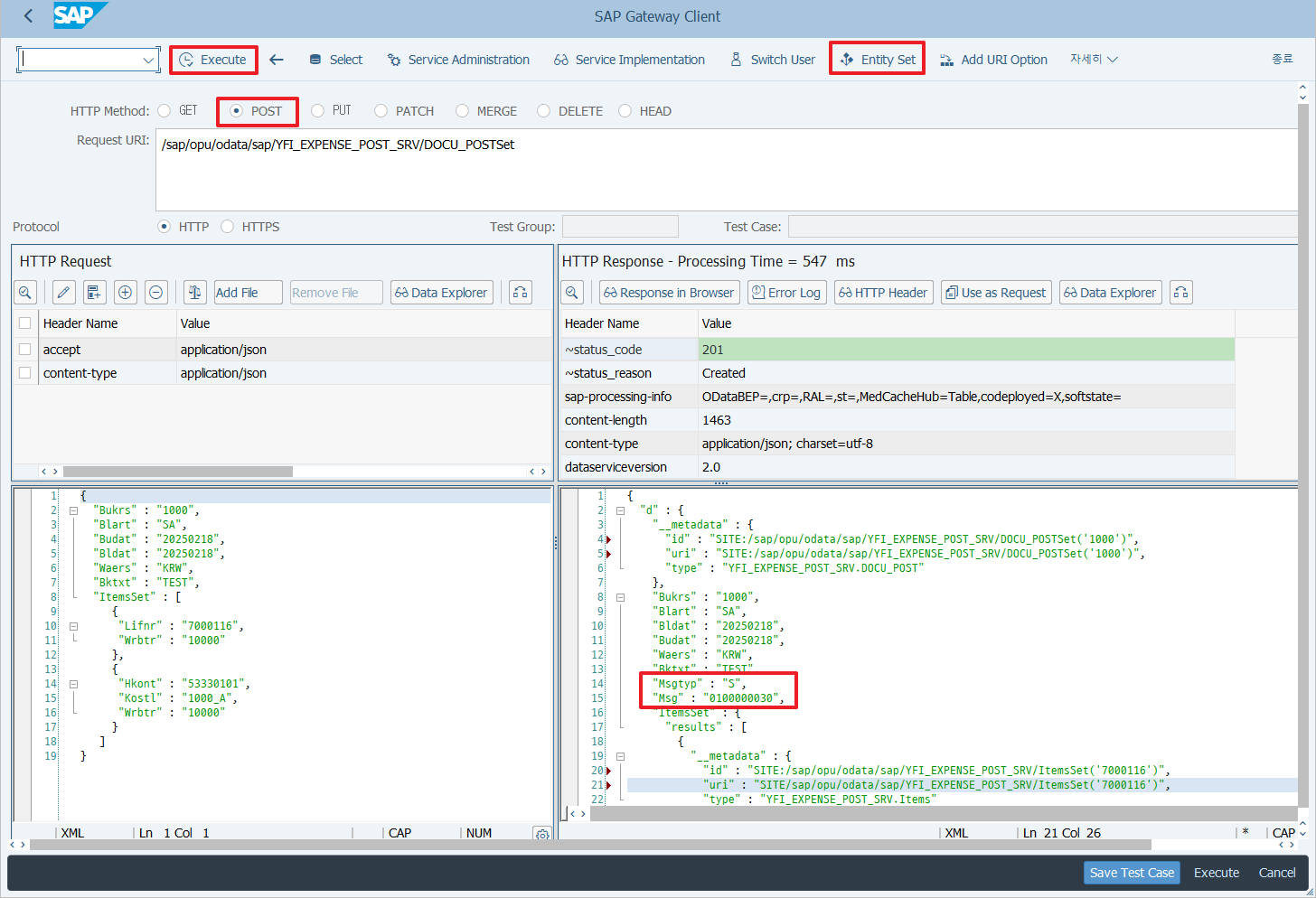 다시 SAP Gateway Client로 돌아와서 Entity Set에서 DOCU_POSTSet (헤더세트)를 선택하고 메소드는 POST , HTTP Request를 json으로 변경한 다음에 좌측 하단에 아래와 같이 대략 입력해주면 전표 생성이 됩니다. (마스터는 본인 회사꺼 사용하세요.)