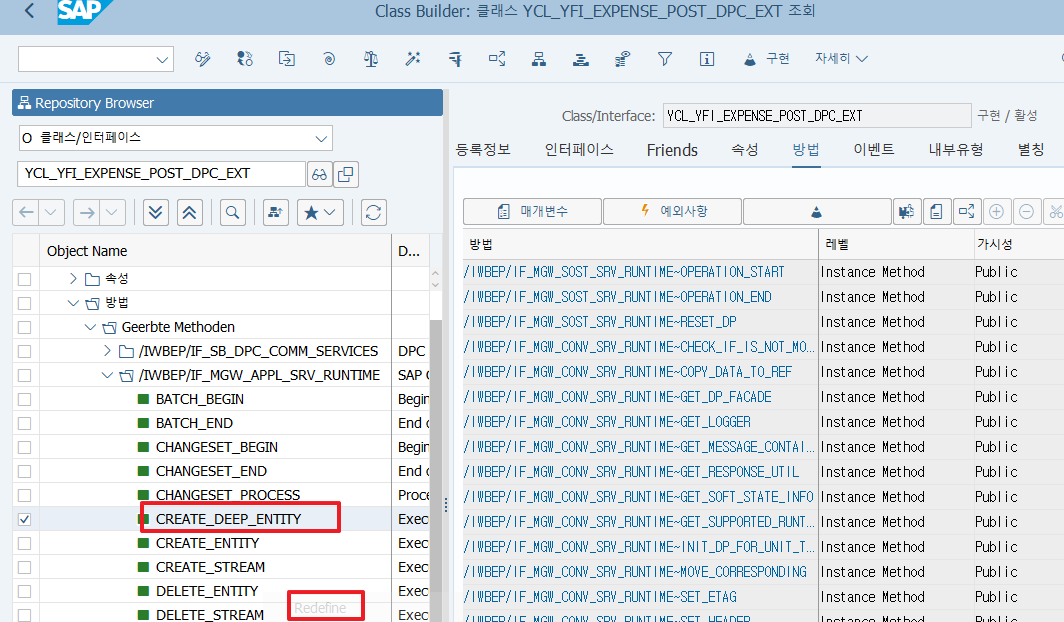 /IWBEP/IF/MGW_APPL_SRV_RUNTIME에서 CREATE_DEEP_ENTITY 우클릭해서 Redefine (캡쳐 잘못됐지만 넘어갑시다....)