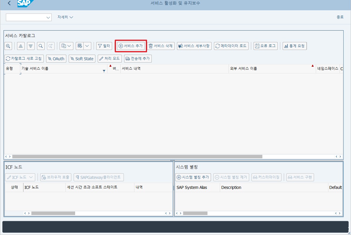 /IWFND/MAINT_SERVICE - 서비스 활성화 및 유지보수로 이동해서 "서비스 추가"