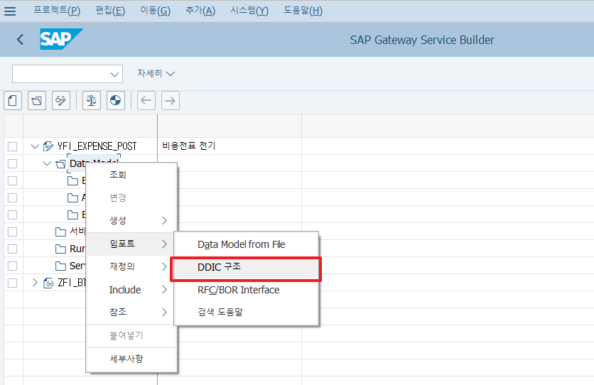 생성이 되면 Data Model 폴더에서 임포트 -> DDIC 구조 선택