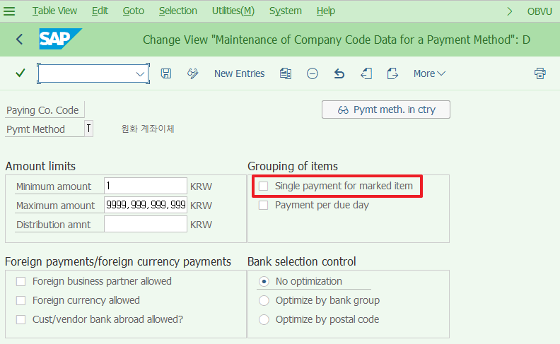 같은 지급방법, 만기일, Block처리 안됨, 전표 입력일 지나지 않음... 문제 없으니 당연히 +/-되어 9백만원이 나올거라고 생각했는데 FBZP에서 회사코드 지급방법의 그룹핑 설정을 찾아보았다.