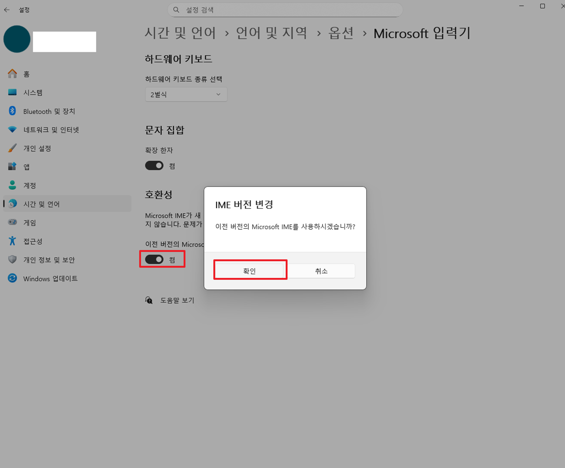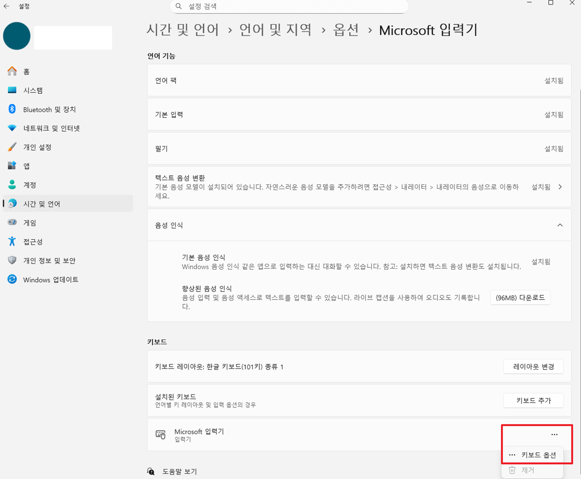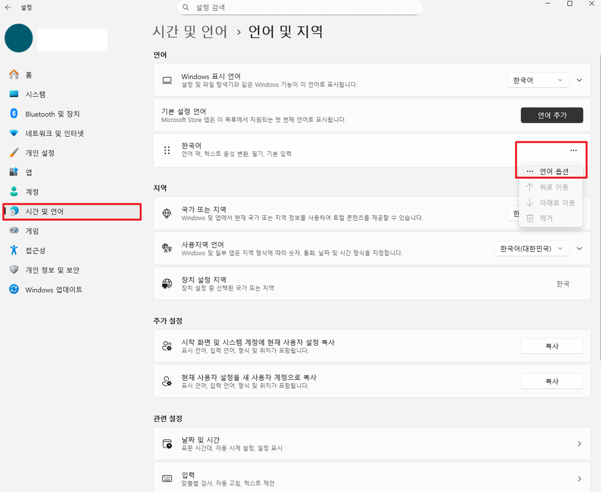 윈도우 설정에서 시간 및 언어 -> 한국어 언어 옵션 선택