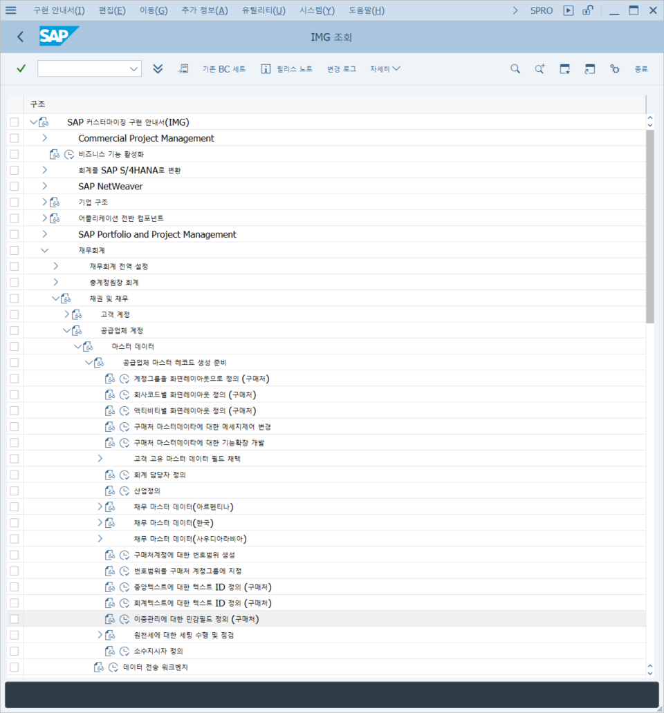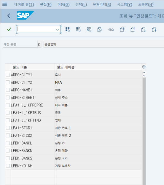 IMG->재무회계->채권 및 채무->공급업체 계정->마스터 데이터->공급업체 마스터 레코드 생성 준비->이중관리에 대한 민감필드 정의(구매처)