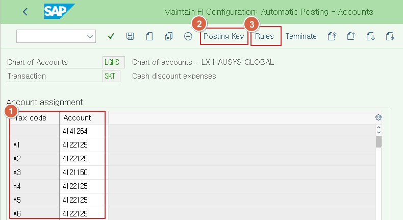 ① 여기에서 세금코드 별로 사용할 현금할인 계정을 설정할 수 있다.