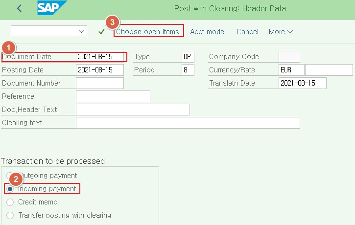 In FB05, set document date as 10 days after baseline date and then select “Incoming payment”. Now choose open items.