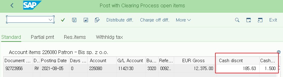 앞의 지급조건에 해당하는 고객의 AR이고 기준일자는 2021-08-05이다. 10일 내에 결제가 이루어지면 1.5% 할인을 받고 11일 이후부터는 할인이 적용되면 안된다.