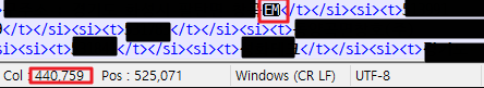 2. xl폴더 밑의 sharedStrings.xml 파일을 편집기로 열고 오류 메시지에 있는 열을 찾아감 (Notepad++ 추천)
