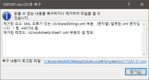 제거된 요소: XML 오류가 있는 /xl/sharedStrings.xml 부분. (문자열) 잘못된 xml 문자입니다. 1 행, 440759 열.