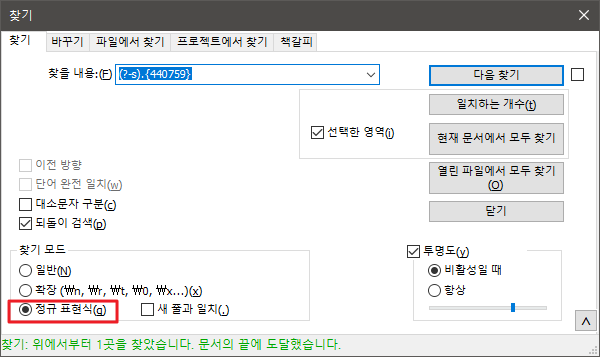 3. 해당 컬럼을 찾아가보니 깨진 문자가 존재한다. SAP에서 Ctrl+G를 누르면 쉽게 찾아갈 수 있다는데 못 찾아가서 검색해보니 Ctrl+F 찾기에서 정규표현식으로도 검색이 된다. 아래와같이 입력해서 찾아보니 원하는 곳에 바로 찾아가준다.