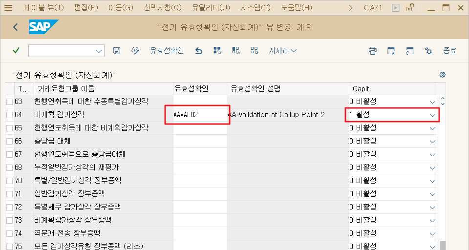 OAZ1에서 본인이 원하는 거래 유형 그룹에 본인 시스템에 설정 된 유효성 확인을 넣어주고 Capit 값에 활성으로 설정한다